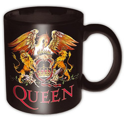 Queen 11oz (approx 320 mls) Boxed Standard Mug in Black ceramic and featuring the 'Queen Classic Crest' design motif. Comes gift packaged in a co-ordinated box