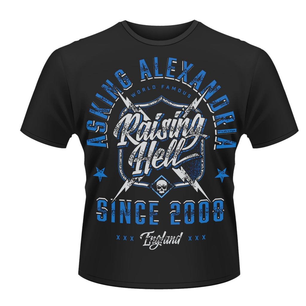 An official licensed unisex cotton Tee featuring the Asking Alexandria 'Raising Hell' design motif. This high quality garment is available in a black colourway. Size options include Small through XX-Large.