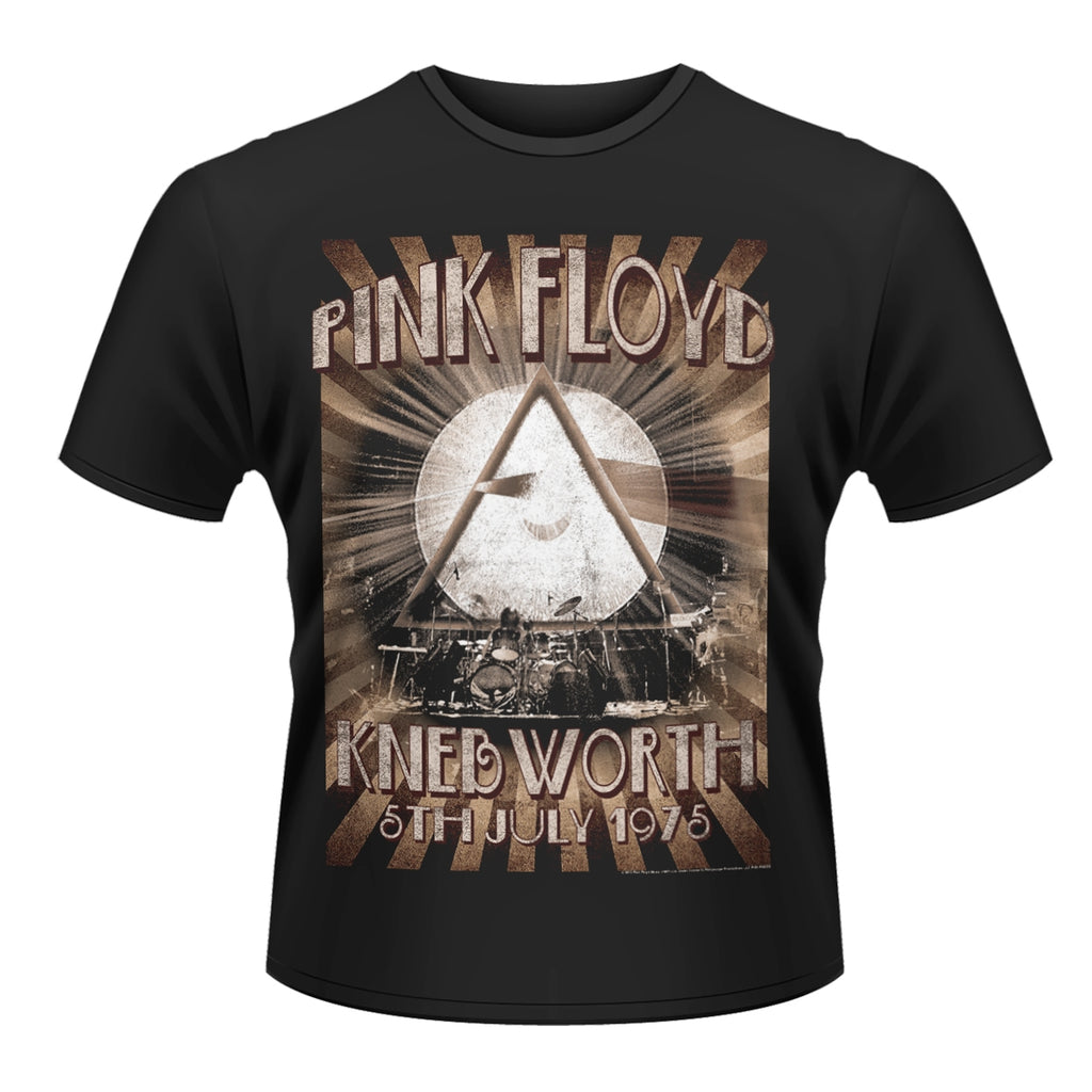 An official licensed men's cotton Tee featuring the Pink Floyd 'Knebworth 1975' design motif. This high quality garment is available in a black colourway. Size options include Small through XX-Large.