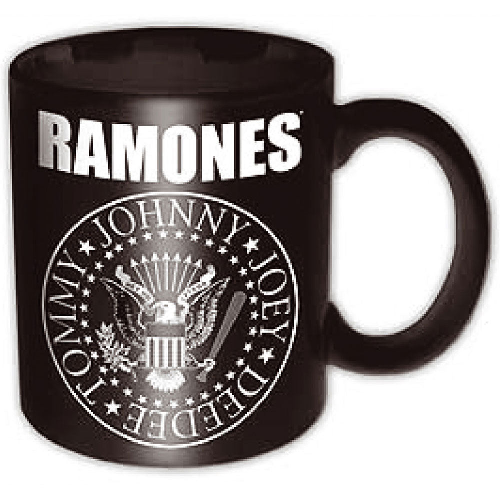 Ramones 11oz (approx 320 mls) Boxed Standard Mug in Black ceramic and featuring the 'Ramones Presidential Seal' design motif. Comes gift packaged in a co-ordinated box